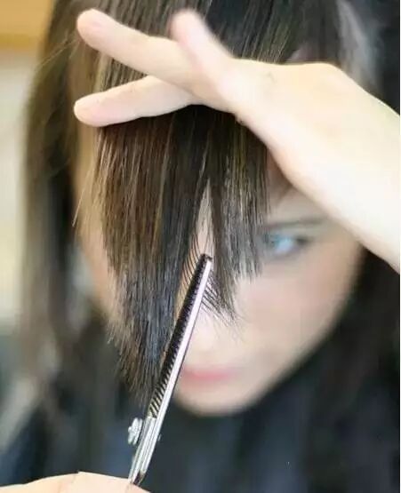 STEP2:rench Fringe的要义之一在于发梢的自然零碎感,因此在平剪之后,需要在发梢1-2厘米处进行疏剪,把刘海拉直拉平,然后对着头发竖着剪哈,注意力度要轻而均匀哦,不然很容易剪出缺口。