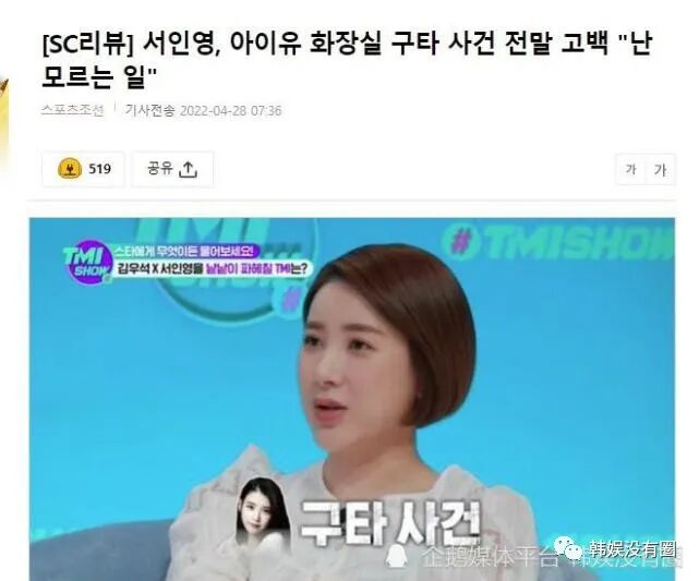 当天,徐仁英对于“自己听到的最荒唐的谎言”说“又要通过我的嘴巴说出来吗?”,表现出了谨慎的态度。韩娱没有圈获悉,接着徐仁英吐露最荒唐的传闻是“iu卫生间殴打事件”,引发了关注。