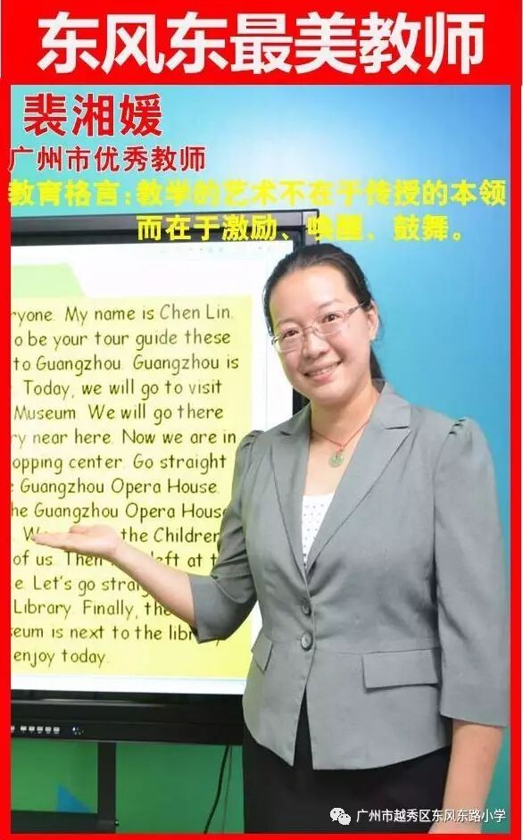 裴湘媛,东风东路小学英语科组长,小学英语高级教师,曾获广州市“优秀教师”、 “青年岗位能手”和全国“跨越名师”等光荣称号,广州市“百千万人才培养工程”第二批名教师培养对象,获国家级奖励30项,省级奖励25项,市级奖励18项。“让孩子轻松、快乐地学习英语” 是裴老师一直努力追求的目标。因此其深受学生们的爱戴。为此,裴老师一直致力于如何开展有效的课堂教学研究,并参与了多项科研课题,发表了系列教育研究论文,其中获国家级奖励8篇,在省市级杂志刊登4篇,具有示范推广作用。