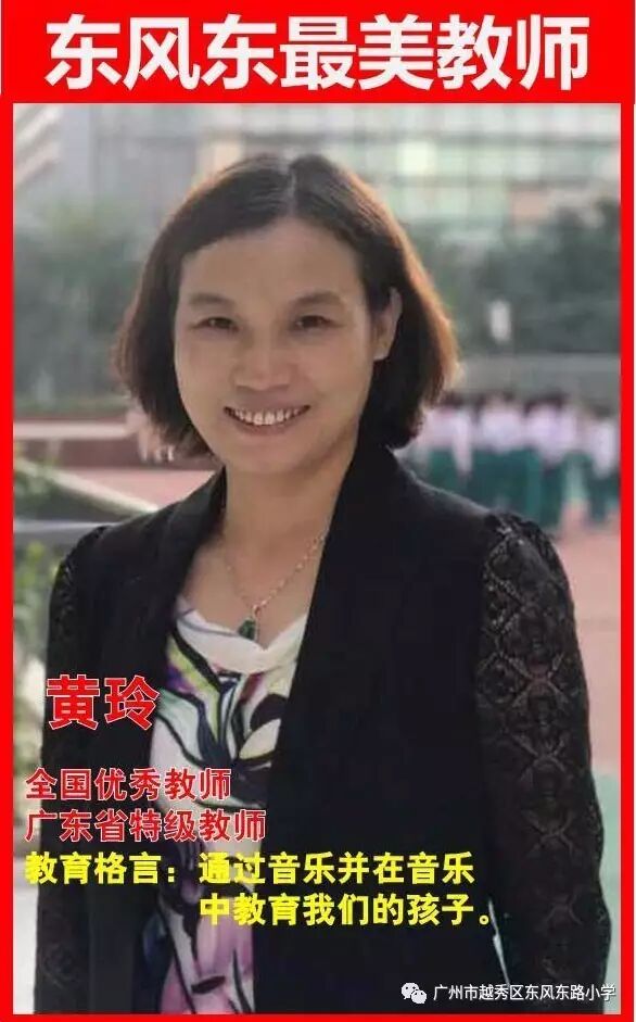 黄玲,广东省音乐特级教师,1989年毕业于广州星海音乐学院,现任广州市越秀区东风东路小学党总支书记、副校长。