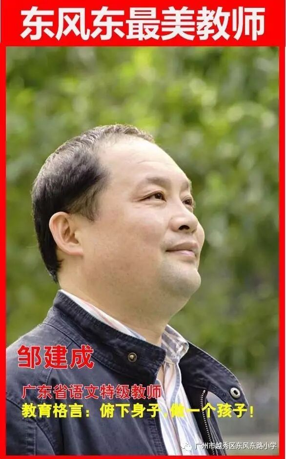 邹建成,广东省第九批语文特级教师、广州市小学语文研究会理事、广州市首届小学语文十佳青年教师、广州市优秀教师、广州市第二批骨干教师、广州市“百千万人才培养工程”小学名教师培养对象、“中国梦·园丁美”广州市中小学青年教师教学基本功和技能竞赛一等奖,被授予“广州市技术创新能手”称号;越秀区第五批名教师。广州市小学语文教师“诗文鉴赏”大赛一等奖,广州市青年教师阅读大赛一等奖。曾在苏州、上海、深圳、江门、肇庆等地执教课例多节。
