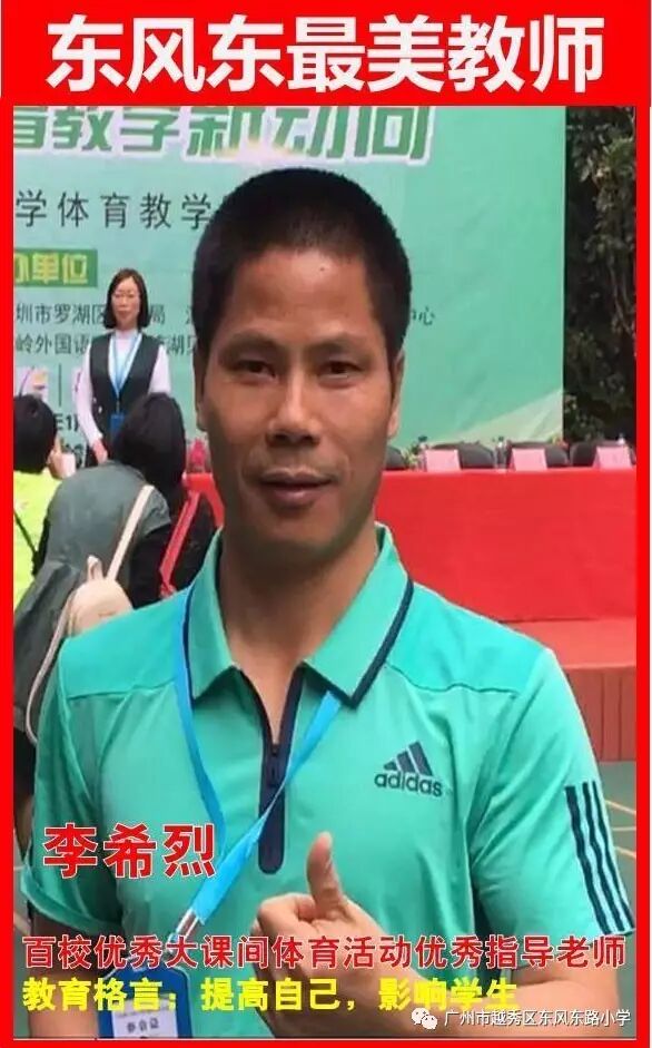 李希烈, 1999年毕业于广州体育学院本科。作为一名体育教师,我用铿锵有力的号令,督促学生踏出坚定的步伐;用热火朝天的训练,帮助学生挺拔稚嫩的身躯。我用强大的正能量,感染着身边的每一个人;我一直坚守心中的信念“一份耕耘,一份收获”,默默无闻,为学校的体育工作不懈努力。