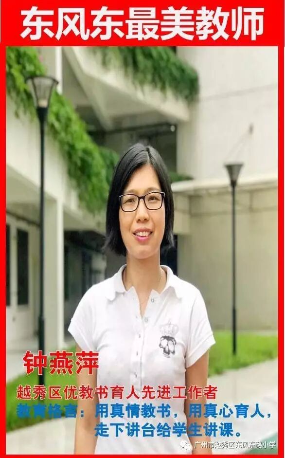 钟燕萍,中学一级教师。出于对生命的敬畏,用激情全身心投入到自己教育情怀,用千百倍的耕耘,换来桃李满园香。从1995年工作至今,不管是教学成绩,还是育人效果,成绩出众,受到历届学生家长肯定,所教学生在世界级、国家级、市级、区级等数学竞赛中获奖达八十多人次。一直以来在学校都是学科带头人,工作中帮扶别人,不为余力,辅助名师新秀走向成功彼岸,为绿叶作人梯已成习惯。参加各级教学设计、整合课例、论文评比、解题能力等比赛获奖二十多项;在教育期刊或教学报发表论文、文章8篇;主编或参与有关书籍编写5本;曾作为导师在广东省内培训奥数教练员;曾获越秀区优秀共青团员、教研积极分子、教书育人先进工作者等称号,获越秀区人民政府嘉奖。