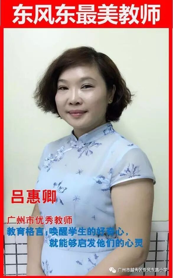 吕惠卿, 1987年加入教育战线,三十年来勤勤恳恳、兢兢业业、热爱学生、团结同事,在平凡的岗位上始终把美术教育视为自己生命历程的一部分,用心去投入, 有进取的精神面貌、鲜明的美术教学风格、先进的教学理念和教学策略、坚实的美术专业和示范表达能力。是广东省美术家协会会员;广州市优秀教师;广州市美术特约教研员;越秀区名教师;越秀区教育委员会美术专业委员会副会长;义务教育美术课程标准实验教科书(岭南版)编委。