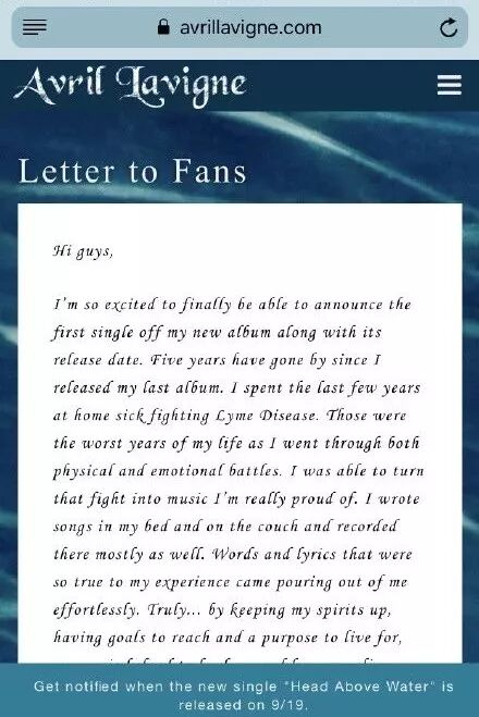 与病魔战斗了将近两年,艾薇儿的身体才渐渐好转。在这次推出新歌之前,艾薇儿就曾写长信感谢歌迷,同时她也在信中提到生病的这段经历: