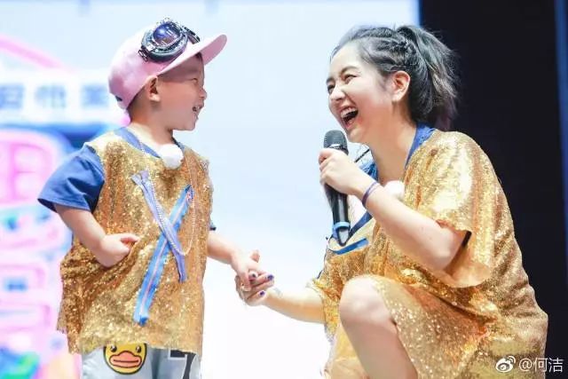 某次演唱会的彩排现场,何洁练着歌,七宝就乖乖的坐在旁边看着妈妈。后来七宝睡着了,何洁给儿子找了个耳机罩在耳朵上,继续练歌。