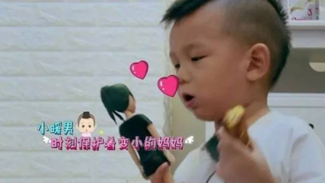有一期节目是妈妈们假装变成了玩偶,七宝没有哭闹,而是两手紧紧地抱着布偶,念叨着“不能把妈妈摔倒了”,还带“妈妈”去吃好吃的。