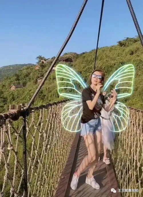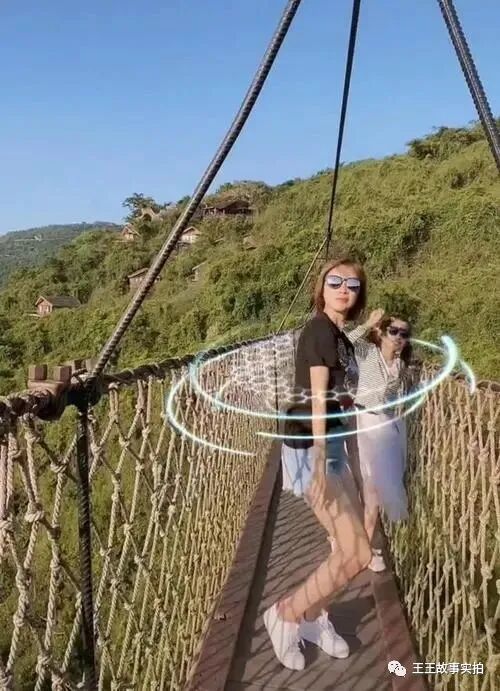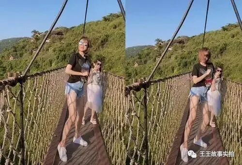 这次在户外,金巧巧就是选择了一件黑色为主的T恤上衣,不过姐姐也是挺胆大的,穿着黑色T恤在铁索的吊桥上跳舞,为了吸引大众的眼球,真是太拼了。