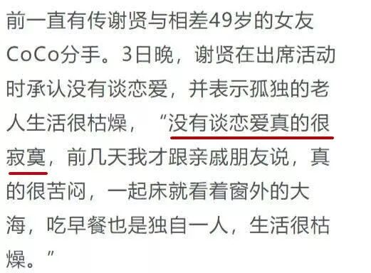 可就是这样互相深爱彼此的这对恋人,在今年却是被指分手。并不是因为感情变淡,而是谢贤年纪越来越大,害怕以后COCO得独自一人,不谈婚约也是想要给COCO自由和后路,甚至也没想过和她生孩子,只因为不像以后单独留下COCO和孩子。不仅如此,谢贤之前更是被曝出给了COCO千万的分手费,可以说是考虑得非常周到了。不过被曝出分手后的谢贤反而是明显看得出十分落寞。