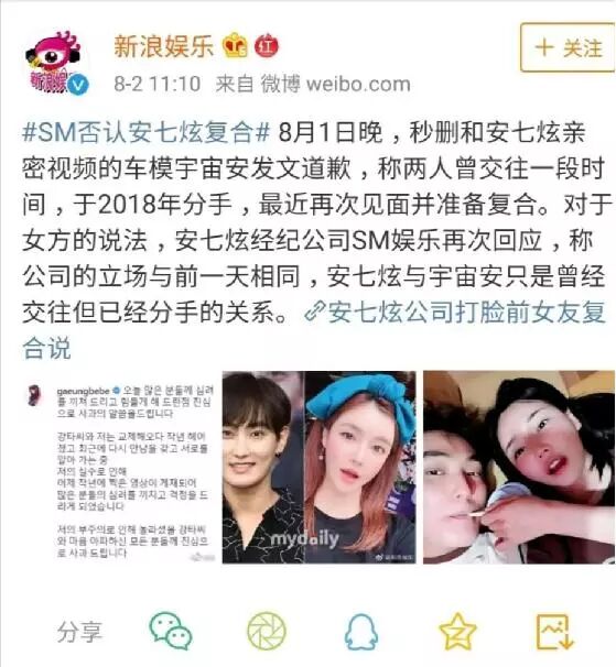 对于两人的关系再次澄清已经不是当初的男女朋友关系,只是普通朋友。但是宇宙安却说自己确实是误发视频,不过在之前一段时间两人确实是又复合了,但是SM公司却说两个人并没有在一起,这是女方单方面的求复合吗?但是安七炫并没有回应,看来是不爱了!