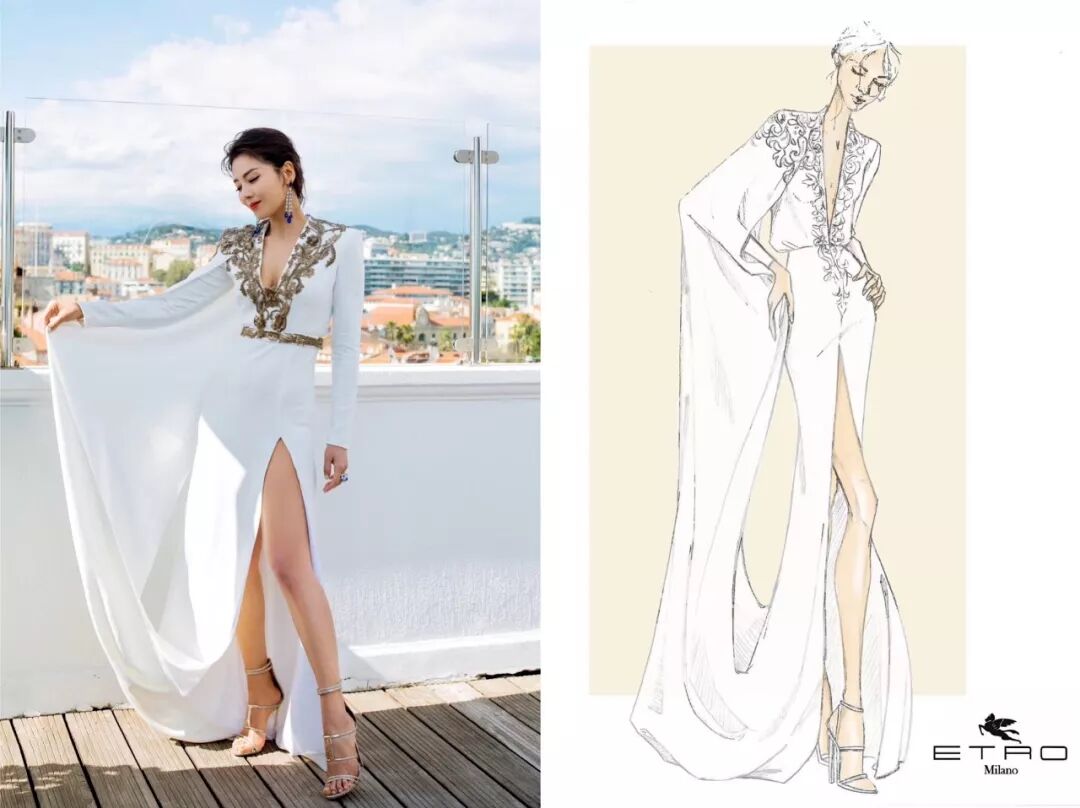 身穿ETRO定制白色深V高开叉礼服,整个前襟处的手工刺绣极尽精致优雅,这样的大女人风很适合涛姐。