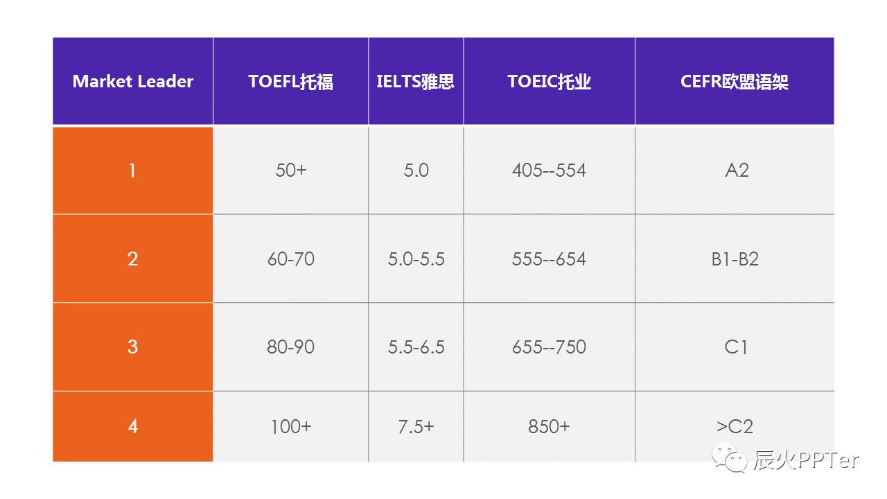 相较于Top Notch,Market Leader的内容更具深度,学习更需强度。而其对接的国际语言测试如IELTS雅思、TOFEL托福、以及TOEIC水平也将更高(下图为对照表)