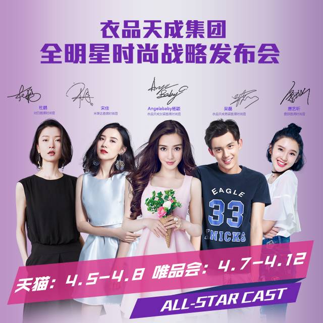 两个事件刚刚隔了一个月,纯属巧合,但这个巧合让衣品天成创始人兼CEO对自己的品牌战略更加自信。今年他大手笔一次性签约四位当红明星:吴磊、杜鹃、宋佳、唐艺昕,加上去年邀请的Angelababy,衣品天成这个从淘宝天猫起家的服装品牌,便一次性拥有五位代言人。这是国内服装行业的第一次。