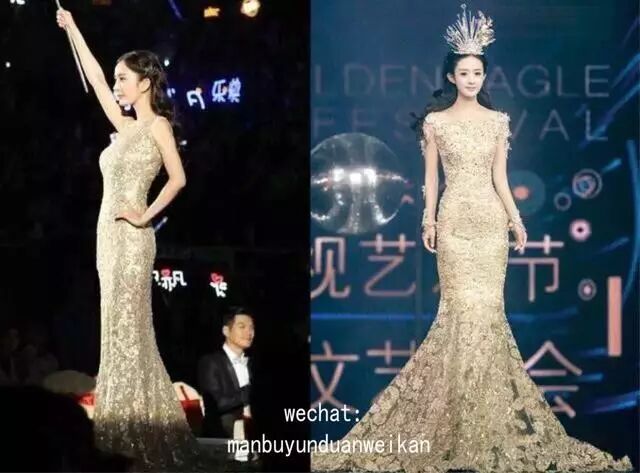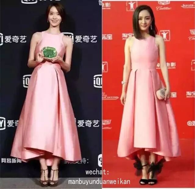 水晶粉色连衣裙林允儿搭配鱼嘴鞋,杨幂则是一字高跟鞋
