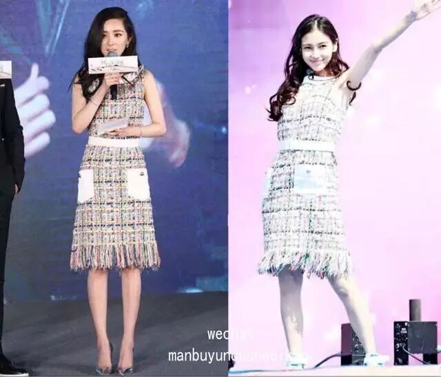 撞衫连衣裙,杨幂搭配银色高跟鞋,baby则是用运动鞋
