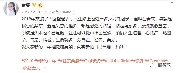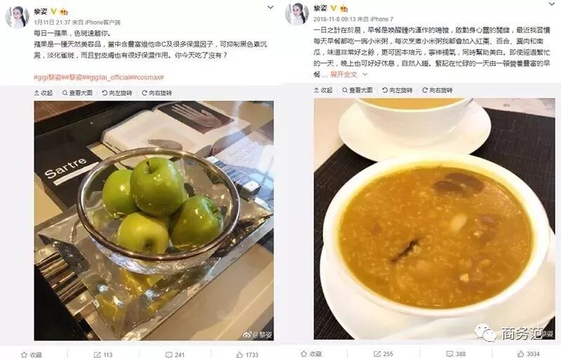 大概是人生经历过太多起伏,看黎姿的微博,在奢侈之外,更多是一些对生活本身的积极态度,就连吃苹果、喝小米粥这种日常小事,她也喜欢品评一番。