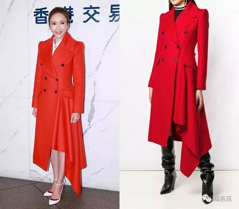 大概是为显“喜庆”,黎姿当天穿了一件红色大衣,这件下摆不规则的大衣来自Alexander Mcqueen,电商售价约3万元,搭配白衬衫和白色高跟鞋,在现场那是相当抢镜。