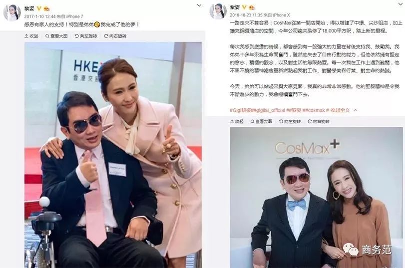 CosMax原本是弟弟黎婴创立的,黎婴曾在英国拿到皮肤科硕士学位,学成回国后便开了CosMax。黎姿当年还是明星的时候,也算是CosMax的“活招牌”,经常为弟弟的公司活动站台。