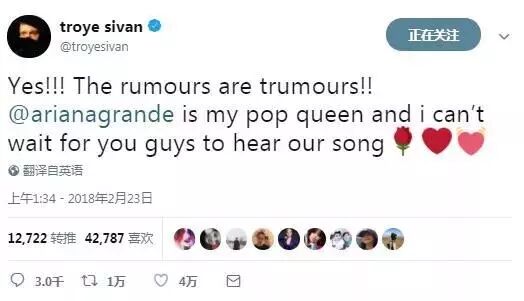 他写道:是的,传闻是真的,Ariana Grande是我的流行女王,我迫不及待想让你们听到我们合作的新歌。