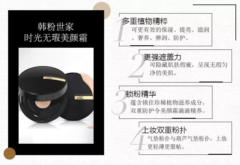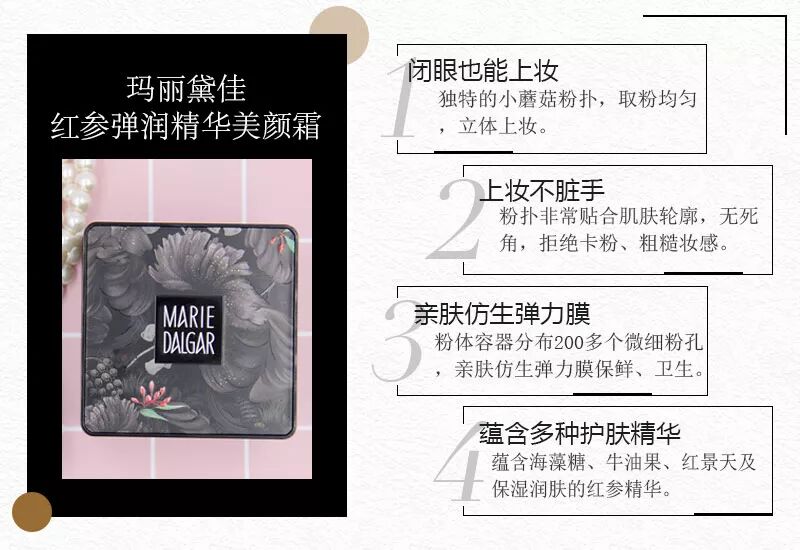 它主要功效保湿、提亮、滋润、遮瑕、上妆快、安全卫生、营养、弹力、防晒、持久锁妆、堪称史上最牛!设计师根据人体工程学匠心设计蘑菇头粉扑,流线型弧度完美转角,可360°零死角的打造无瑕轻透妆容。