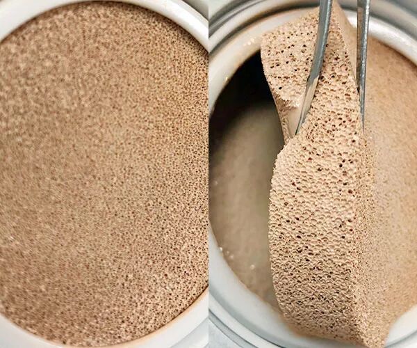 美颜霜也是像气垫BB一样放在容器里,它的表面覆盖了防菌仿生弹性膜,上面均匀分布着数百个精创微细粉孔,也是需要用粉扑将美颜霜按压出来。