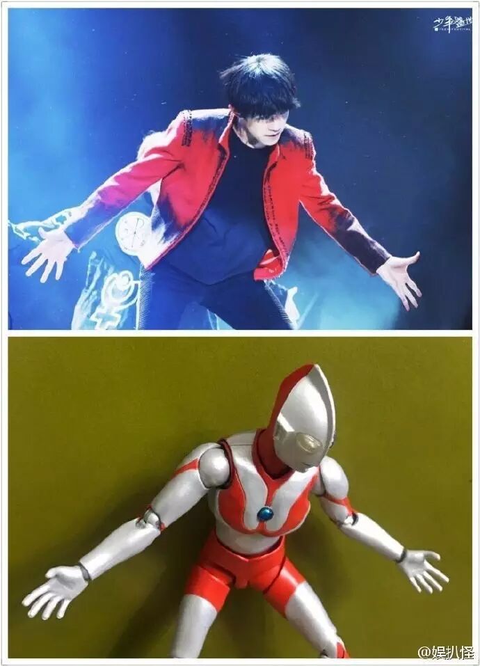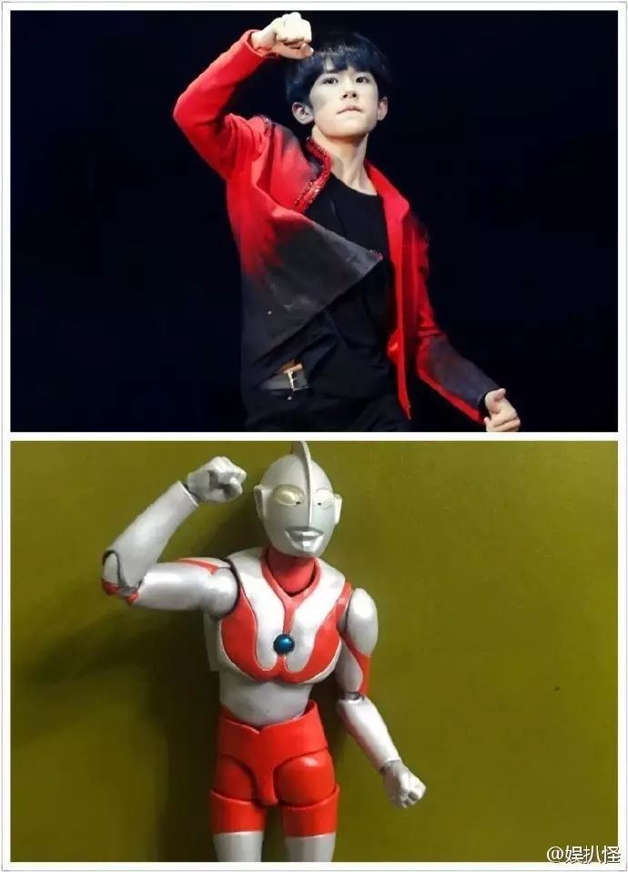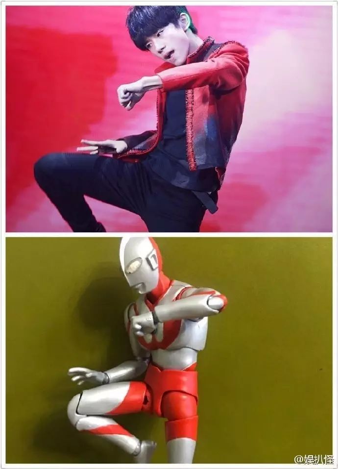 从网友公布的易烊千玺和奥特曼的动作对比,简直毫无违和感,一模一样。