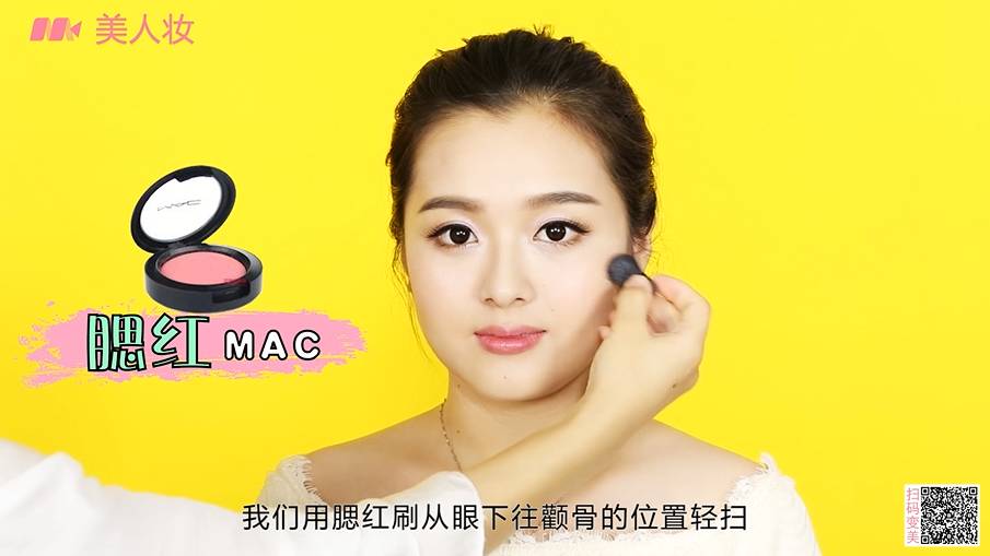 腮红,赵丽颖的腮红多数偏可爱粉嫩系,用腮红刷从眼下往颧骨的位置轻扫。