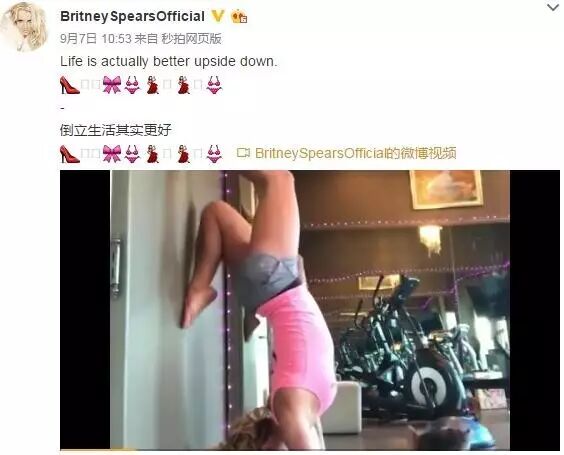 9月7日,小甜甜布兰妮在微博上晒出一段自己在健身房练习倒立瑜伽的视频,还配文:“倒立生活其实更好”。视频中,布兰妮随意扎起一个丸子头,身穿桃红色背心配灰色短裤,靠在墙边倒立,还不时变化腿部动作,看上去身材健硕吸睛。网友纷纷留言:“厉害”、“汉娜好萌”、“cool”。