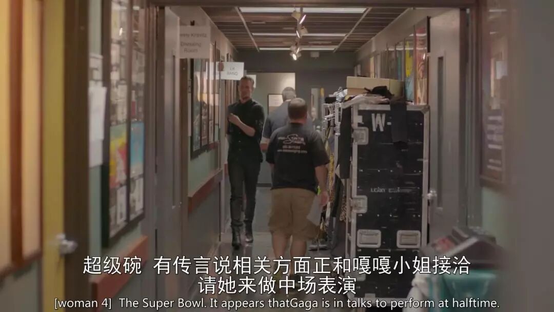 在超级碗表演前的后台,Lady Gaga坐在钢琴前,经纪人告诉她:你上了这个舞台就说明你是闪耀的巨星,你后半辈子都会在体育场开演唱会。Lady Gaga一脸震惊,半晌说不出话。