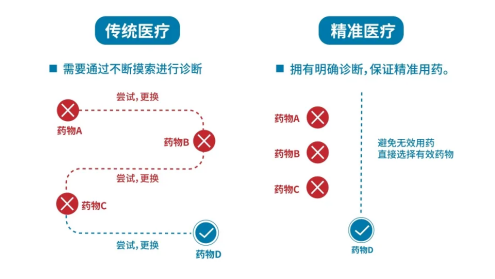 与传统医疗相比,精准医疗以患者个人基因组信息为基础决定治疗方案,能够更精确、更高效地治疗疾病,减少患者痛苦,同时避免不必要的经济损失。