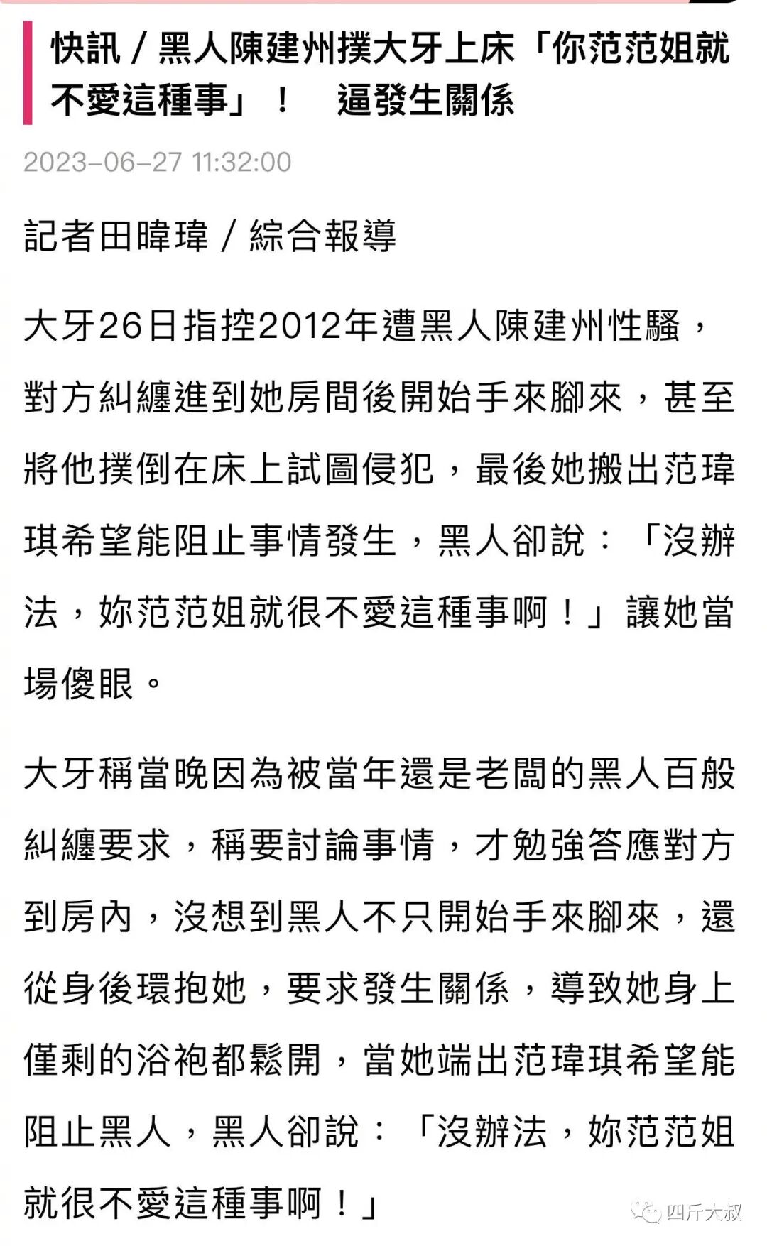6月27日,娱乐圈再曝大瓜,知名女歌手范玮琪的老公,黑人陈建州被曝性骚扰女艺人,并且当时陈建州已经和老婆范玮琪结婚!