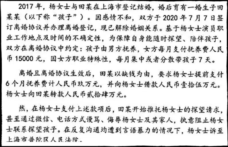 田亮怒斥妻子出轨,大爆“细节内幕”!反转来了:他这次彻底完了! LADY逛逛 内地男星 2022-12-22 12:30:37 403 创作不易,用心坚持,欢迎请BaGua喝几杯爱心咖啡!打赏并支持本文 打赏并删除本文 当你穿一件平淡无奇的衣服若能戴上珍珠,必然气度不凡每个女人的一生都该有一条小黑裙,一个珍珠配饰12月28日,「珍珠专场」超多福利等你来抢!快速预定直播间点击预约,不要错过!!前段时间,演员田亮突然连发数条微博,怒斥妻子出轨:“你潇洒快活的时候有想过儿子吗?儿子发高烧喊妈妈的时候你在和别人开房,你配儿子叫你一声妈吗?““今天宣判了,你输了,你的罪过不要连累孩子!““感谢法律的公正,我们赢了!”短短几句话,就给前妻扣上了一个对婚姻不忠的罪名。还大胆披露“开房细节“,揭开婚姻里不为人知的内幕,一度闹上热搜。但随着事件愈演愈烈,出乎所有人的意料的是,更恶心的一幕发生了……事实并不是田亮控诉的那样。反而恰恰相反。他和妻子杨明娜早已离婚,不存在任何出轨的情况,一切都是空口无凭。所谓的发文指控、指责杨明娜不配为人母也不过是误导大众的情绪罢了。如此下三滥的抹黑前妻,杨明娜忍无可忍在社交平台上发表律师函以证清白。为了孩子的安宁隐忍至今,但田亮一直在说谎,逼得她不得不拿起法律武器反击。杨明娜平时忙于拍戏,儿子的抚养权判给了丈夫,她每月要支付1.5万元赡养费,得到了7天探视的时间。两人离婚后,田亮向杨明娜借了15万元,并要求提前支付6个月的赡养费。杨明娜为了孩子,一一满足了田亮的要求。但田亮并没有就此罢休,反而变本加厉提出更多不合理要求。他多次以孩子为由向杨明娜要钱,不给钱就剥夺杨明娜探望孩子的权利,还经常骚扰杨明娜和她的家人。被拒绝的他恼羞成怒,于是罔顾事实在网上大肆抹黑和抨击前妻杨明娜。这么做的目的就是想通过这种极端的方式让杨明娜妥协,以此来敲诈更多的抚养费。在杨明娜曝光证据和律师函后,田亮才终于有所忌惮。这场荒诞的闹剧才算告一段落。在此之前,很多人并不了解这对夫妻是谁。杨明娜毕业于上海戏剧学院,和马伊琍、保剑锋等人都同学。杨明娜从出道就一直活跃在娱乐圈,参与了很多作品的拍摄,是戏红人不红的代表。最具代表性的角色是《倚天屠龙记》的金花婆婆和《神雕侠侣》里的中年黄蓉。由于经常扮演“师娘”的角色,她被网友亲切加冕为“最美的师娘”称号。2017年和田亮在上海登记结婚,同年生下一子,开始慢下来享受生活。田亮虽然是演员,但在娱乐圈的名气并不大,演绎事业并无太大的水花,知名度远不如妻子杨明娜。最出名的角色就是在电视剧《喜耕田里的故事》扮演喜青山。相对于妻子,很多人都不认识他,对他的了解甚微。杨明娜比田亮大三岁,两人因拍戏相识,田亮对杨明娜一见倾心,随即展开猛烈追求,最终抱得美人归。结婚后的他们感情很好,孩子出生后更是其乐融融。但没想到,昔日的恩爱夫妻有朝一日也会在公众平台上开撕,上演分崩离析的戏码。正所谓离婚见人品,当婚姻散场时,才能知道一个人的品性究竟如何。有些夫妻,就算没感情了,依然尽最大努力维持体面,做到和平分手,好聚好散。但有些人,总是不依不饶用尽下三滥手段,想方设法让对方吃亏。《释妻书》说:“解怨解结,莫说相恨,一别一别,皆大欢喜。”一句“好聚好散”说得简单,但并不是每个人都能做到。就像当初的黄奕和黄毅清一样。黄奕在怀孕六个月时遭受黄毅清家暴,丝毫不顾及那时的她有孕在身。为了实时监控她,黄毅清在家里安了几十个监控器,盯着她的一举一动。黄奕好不容易离婚解脱后,却被黄毅清编造各种黑料,还晒出经过处理的私密照片,搞坏了一个女演员最重要的清誉和名声。将黄奕推入了更深的地狱,导致她负面新闻不断。黄奕不仅欠下巨额债务,事业也受到了前所未有的打击。黄奕曾亲口说,“这段婚姻很失败,很糟糕,对我来说就像一场噩梦。”很多夫妻在结婚初期,把自己的坏习惯有所收敛克制,但随着时间的流逝,本性开始不加掩饰。只有真正结束一段婚姻时,才能看清一个人的真面目究竟如何。而对于孩子来说,伤害最大的,不是家庭的不完整,而是父母的互相伤害。也许一个合格的前任就像去世了一样,最好不要再出现在对方的生活里。但这句话并不适用于有孩子的离婚夫妻。无论孩子的抚养权在谁手里,孩子都是两人之间的一个纽带,有孩子在,这份亲情就永远割舍不断。贾静雯和前夫孙志浩在离婚时撕破脸,闹得十分难堪。但多年之后,在梧桐妹的毕业典礼上,两人共同出席,还大方合影。只为给孩子留下一个美好的回忆。离婚并不代表老死不相往来,爱情没有了,但亲情还在。大部分离婚的夫妻,在谈到前任时,都会有些许的尴尬或是怨言。这种情绪也会在不自觉中影响孩子的认知。伊能静在这一点上做得真的很让人佩服,她曾经对儿子说:“你要像你爸一样,别学我,虽然什么都试过,但一事无成。““你爸爸不一样,如果说到中国音乐,你爸爸是第一个把西方音乐带进来的,没有第二个人。”娱乐圈里分分合合,离婚的人不少,离婚后老死不相往来的也有很多。无论两人是因为什么原因离婚,伊能静能在儿子面前这么客观地评价前夫,实属难得。有情感作家曾说,爱情里最棒的心态就是,“我的一切付出都是一场心甘情愿,我对此绝