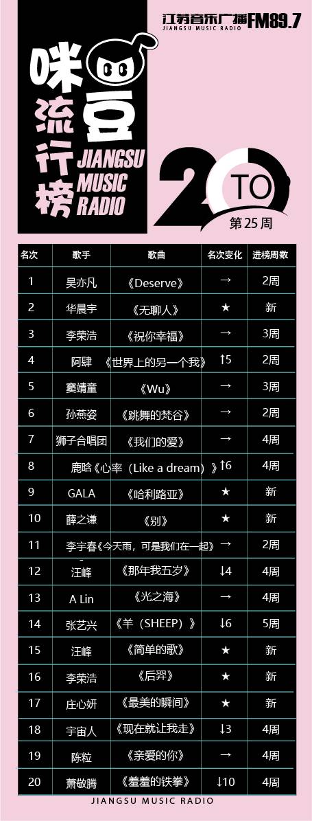 本期咪豆流行榜本期冠军依旧是吴亦凡,之前上过的一次榜单的华晨宇的《无聊人》这次直接登录到榜单第二名,紧随其后依旧是李荣浩《祝你幸福》。