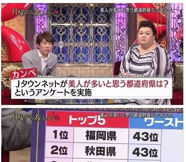 日本人喜欢搞各种评选,电视、杂志上的民间调查,“你认为哪个都府道县美女最多”,几乎隔一两年就要民意票选一次,最新的一次是2015年,排第一的是福冈县,第二是秋田县,以下才是京都、北海道、东京、冲绳等地。