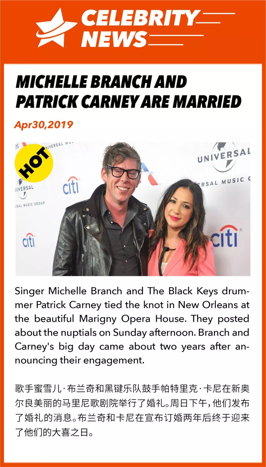 Singer Michelle Branch/and The Black Keys drummer Patrick Carney/tied the knot in New Orleans/at the beautiful Marigny Opera House. They posted~about the nuptials on Sunday afternoon. Branch and Carney's big day/came~about two years after announcing their engagement.