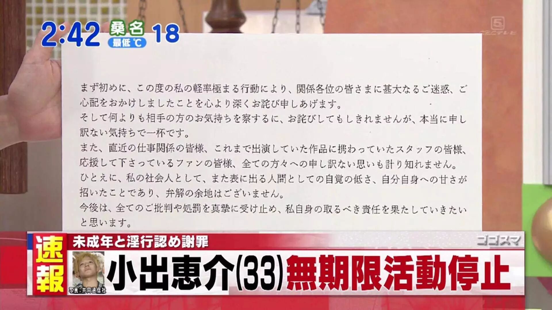 根据电视,今年5月他在拍NHK电视剧的时候,把一个17岁的女高中生叫到酒吧,劝她喝酒,强行和她发生了肉体关系。