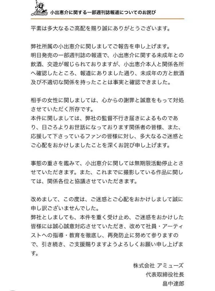 今天中午小出惠介的事务所AMUSE宣布将无限期暂停他的活动。