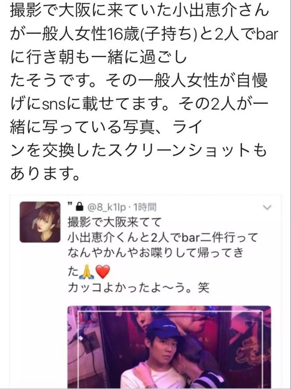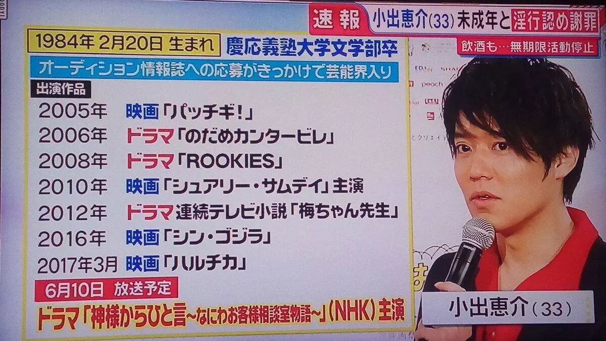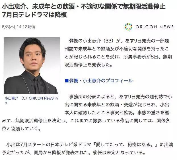 小出应该是不少人(包括我)有好感的演员之一,出了这种事也只能叹气了。日本对未成年这一块管的非常严,之前的川谷不伦没事,和未成年交际也被暂停活动。希望好好反省吧,演员生涯可能是毁了......