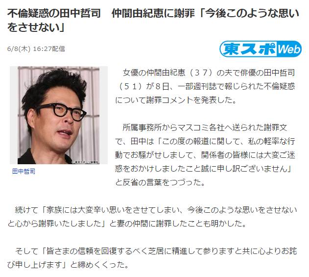 今天田中发表了声明,向妻子和关系者谢罪: