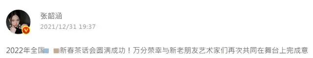 她在配文中直言这次茶话会圆满成功,她万分荣幸与艺术家们一起在舞台上完成了这个意义重大的演出,感恩台前幕后的每一位,祝福大家2022更美好。