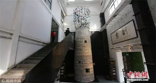 中新网讯:在西安老钢厂设计创意产业园的一个老厂房里,伫立着一座用近15吨大学教材堆成高11米、直径2.5米的书塔。这座书塔书的来源,一是北京一个出版社的库存建筑书,二是西安一些大学的旧教科书,一共采购了15吨,每吨旧书花了2000元。老老钢厂工程设计创意产业园工程部的司盛方先生带着8人,加班加点干了10天,垒起了这座书塔。