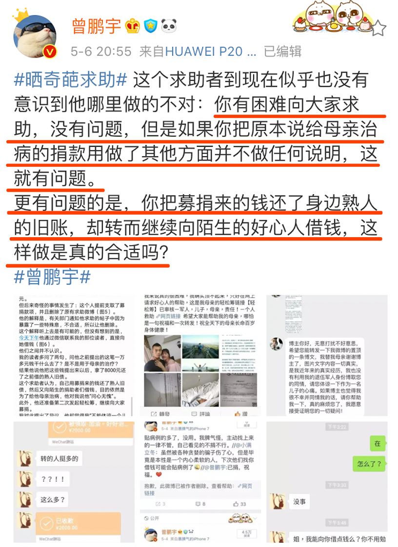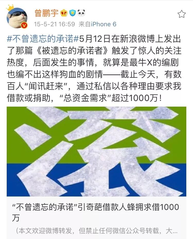 无独有偶,博主@曾鹏宇遭遇的借钱噩梦似乎更可怕。15年的时候,他在微博发表了一篇文章,讲述了3年前,他曾在微博上看到一个大学生在募捐救父,承诺会在3-5年内偿还借款和支付利息。