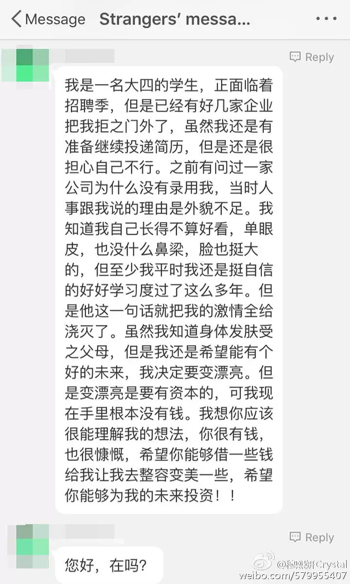 有大学毕业求职的时候,觉得自己长得不好看,找穆熙妍借钱整容,希望她能够投资自己的未来!人家穆熙妍跟你非亲非故,凭什么要给你的未来投资呢?