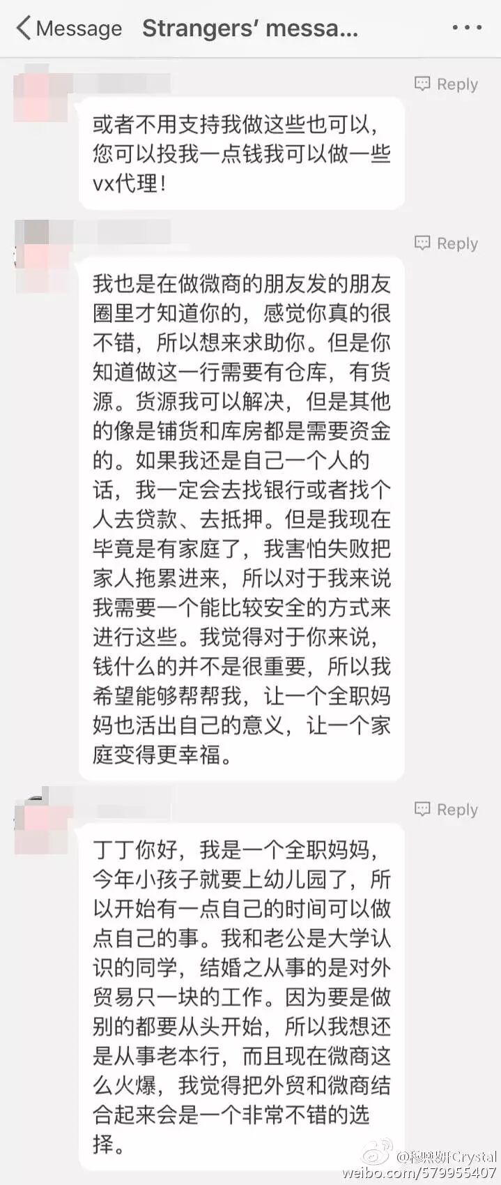 还有当了全职妈妈后,想做微商,不想从银行借款,怕拖累家庭,让她投资的。