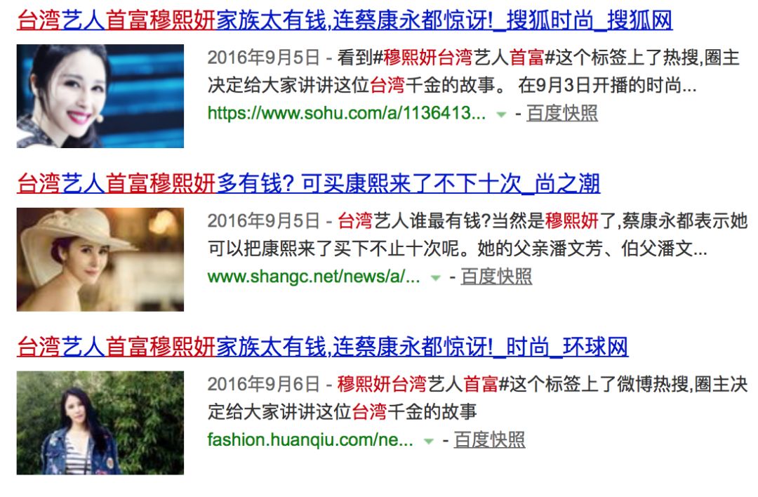 台湾艺人穆熙妍就曾遭遇过很多伸手党的侵袭。网上新闻随便搜一搜都是关于台湾艺人穆熙妍家里很有钱的报道。
