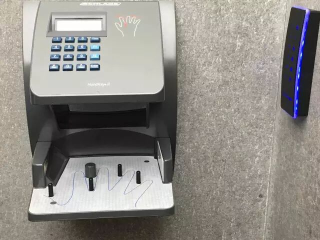 两种进入方式:密码&掌纹。右边的是密码验证器,左边的是掌纹验证器。把手放上去,嗖地一扫,就能进去了。