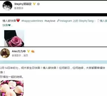 2月14日情人节时,方力申和邓丽欣分别在微博上发文祝福大家“情人节快乐”,却没有任何互动,也没有互相示爱。