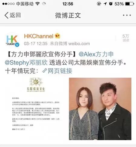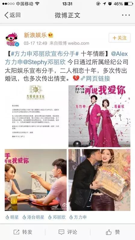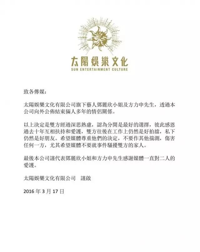 3月17日,银幕上和现实中的双重情侣方力申、邓丽欣通过经纪公司太阳娱乐宣布,结束十年爱情长跑。