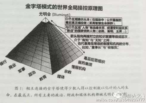 光明会在社会中创建了一个金字塔结构,以便他们操控全球大局,但是只有很少人知道它的存在。在金字塔塔尖有不超过13个的精英组织,它们通过秘密结社的网络,创造并接管了整个控制体系。它们所服务的网络和血统分别被称为“光明会”和“受启发的人们”。换言之,成员们受知识的启发,而别人都是愚者。光明会是所有重要组织中的一个,它就像是癌细胞。所有主要的秘密社会团体谨慎地挑选、培育新成员到光明会,他们就是你看到的在全世界掌权的人。他们渗透了所有种族、信仰和国家。如果你爬得足够高,你会发现所有的跨国公司,主要的政党,秘密结社,媒体帝国和军队(比如北大西洋公约组织)都被同一个金字塔控制。在这个金字塔的顶端,你会找到很多光明会中血统最纯净的人。这样,他们可以通过看似毫无关联,甚至是对立的社会领域,实施相同的政策。这就是他们在生活的每个领域中创造集权激增的方式:政府、财政、商业、媒体、军队。这些并不是偶然,而是早已计划好的。