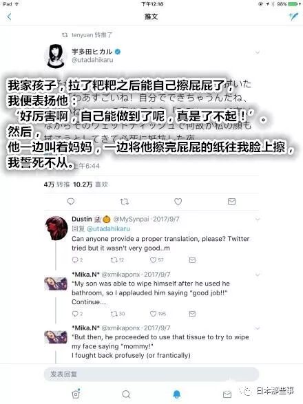 宇多田光不但在歌唱界人气大火,在社交网络上也是被粉丝们评价“可爱耿直”。2014年宇多田光生下一子,经常在社交网络上吐槽自己的儿子“我那个五个月大的儿子放屁真的很臭”总是说“带孩子实在是太辛苦了啊!”可谓是实力坑娃了。